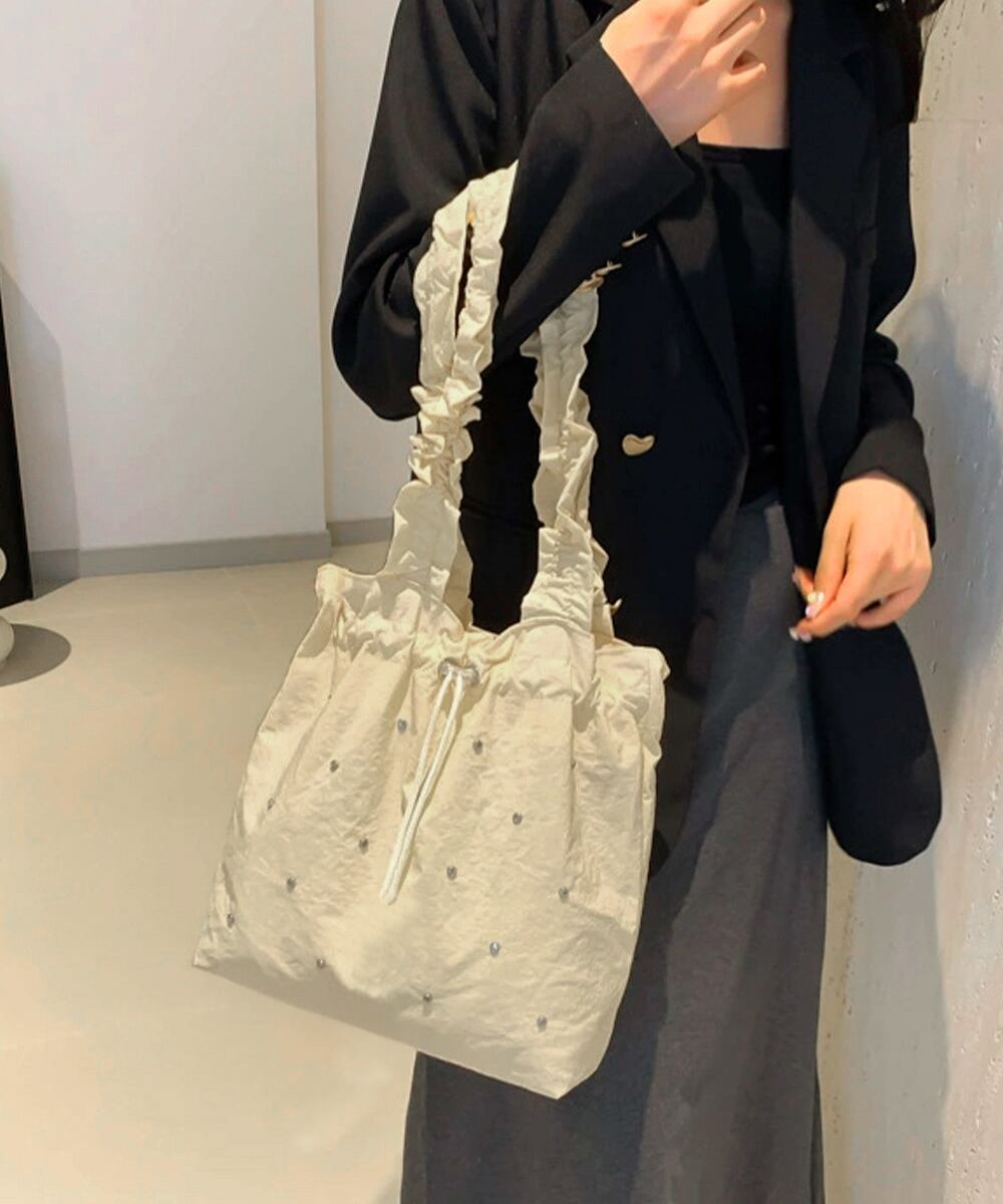 フリルハンドルと小粒ビジューが可愛い、巾着デザインのトートバッグ。