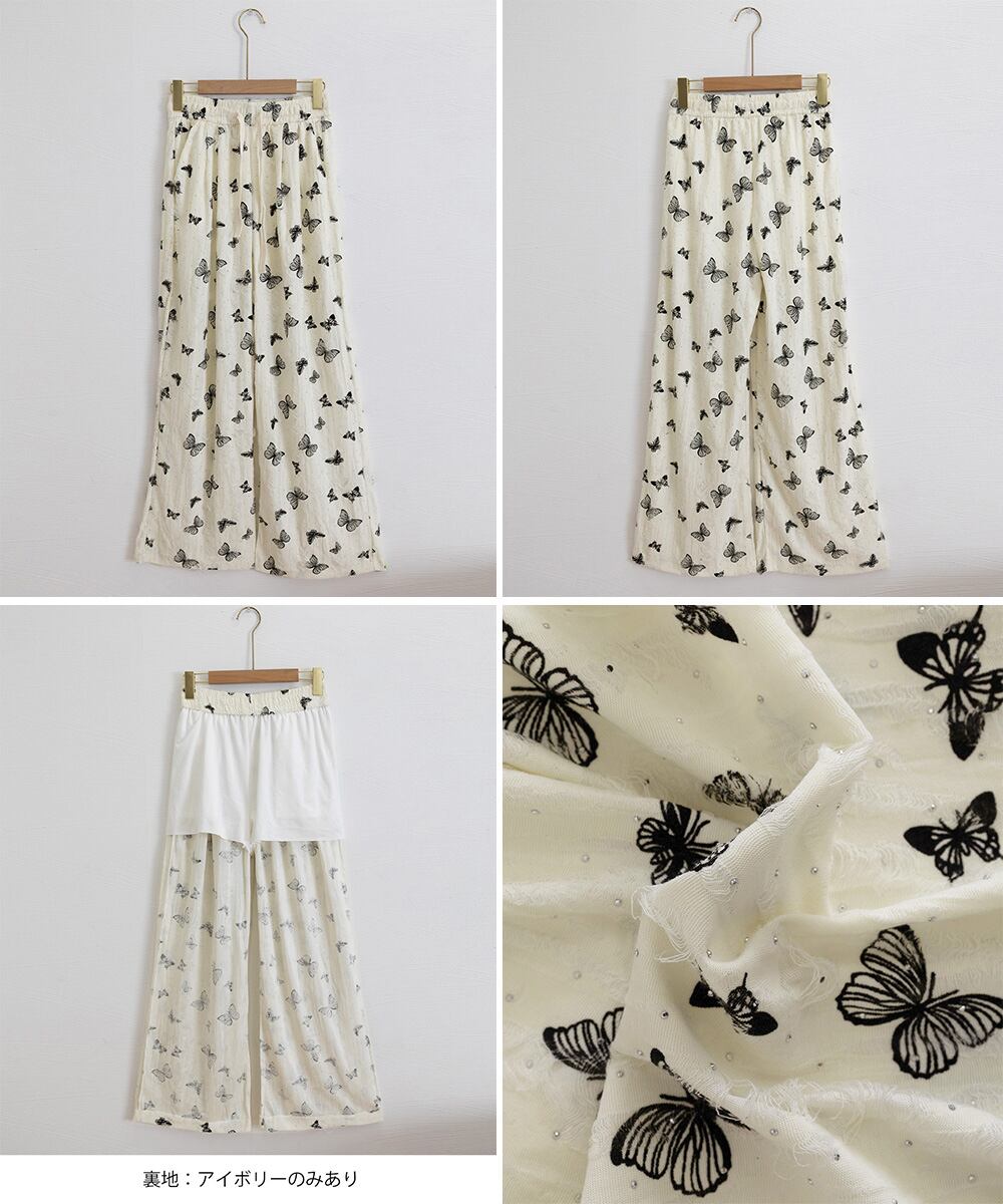 蝶柄ワイドパンツ ダメージロングパンツ夏