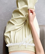 ウエスト部分の繊細なレースディテールと細めのリボンがガーリーさを演出。