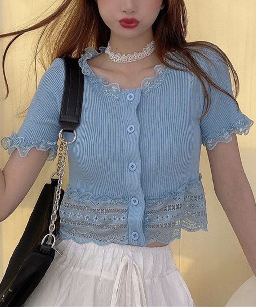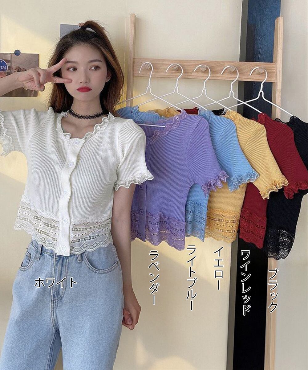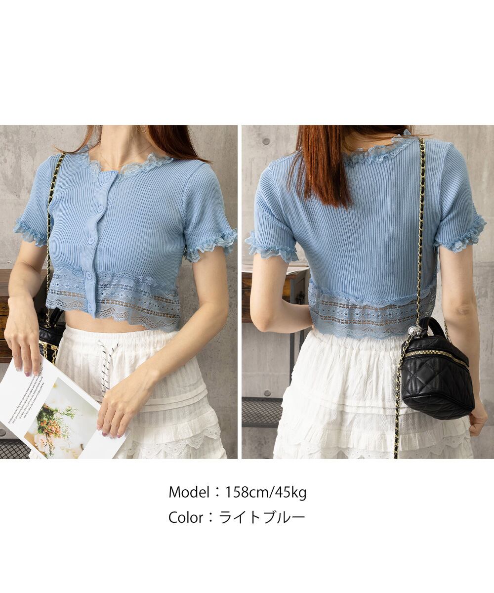 ガーリーなムード漂う、レース付きリブカーディガン。