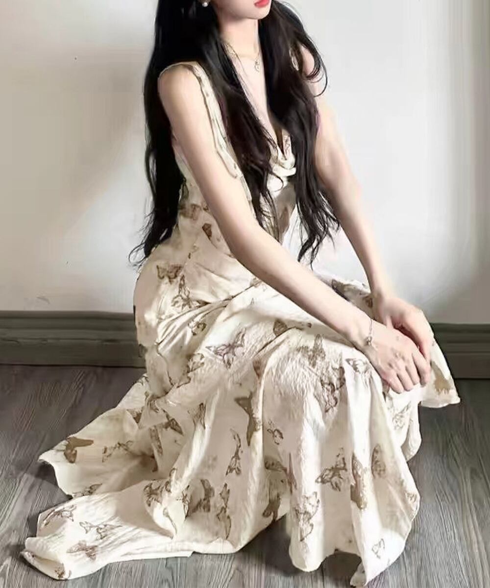 蝶柄が目を引く、フェミニンで華やかなキャミソールワンピース。