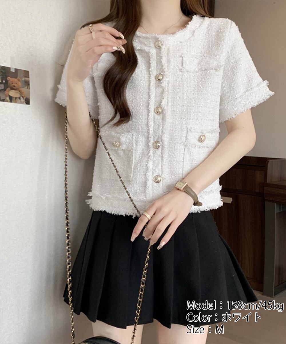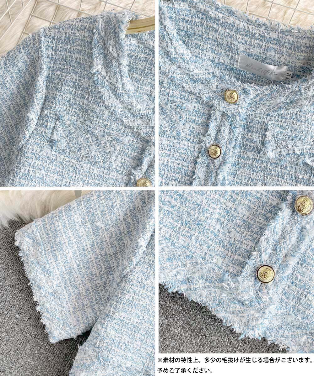 上品な雰囲気を纏える、ツイード風の半袖ノーカラージャケット。