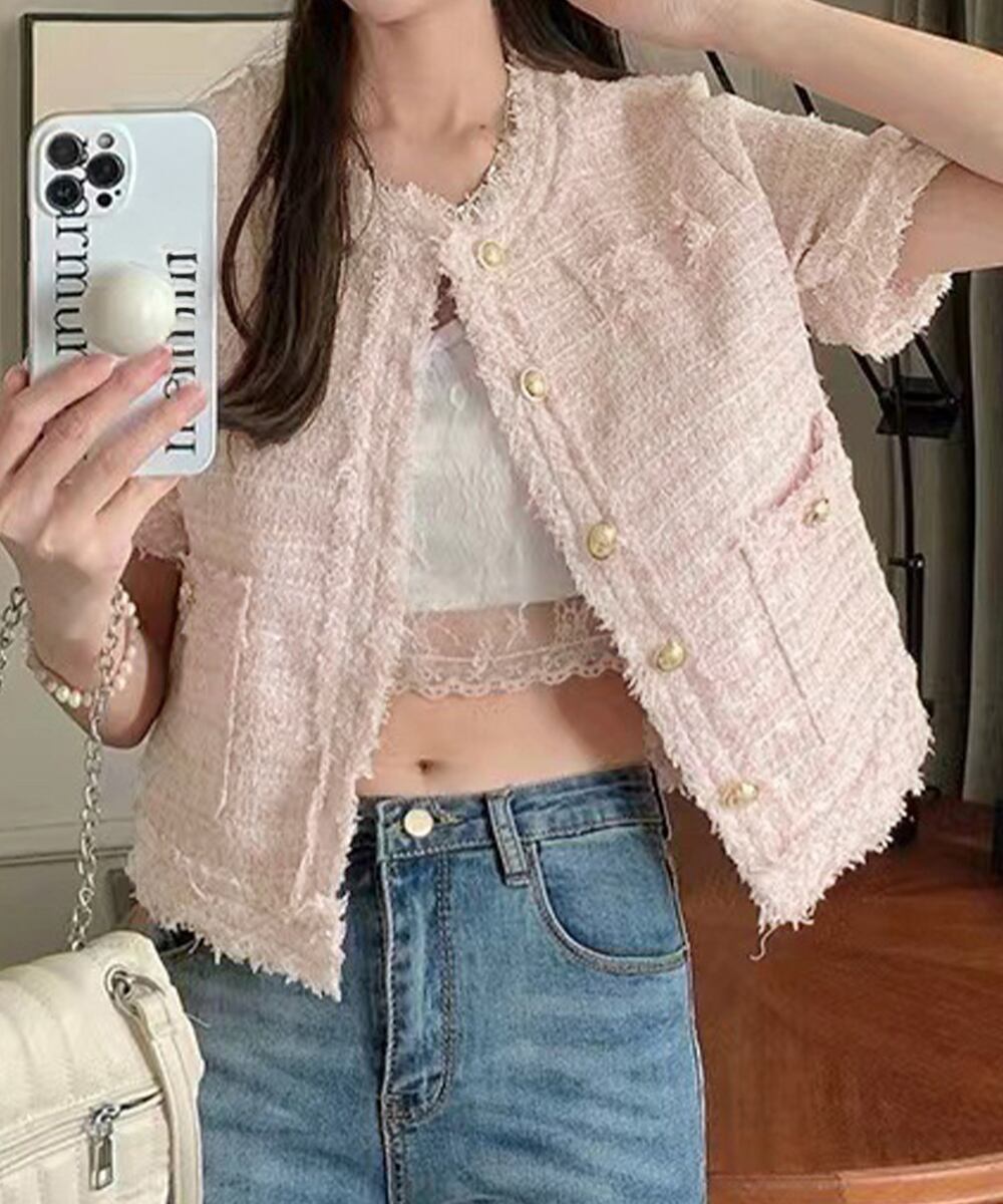 ショート丈アウター 春夏 ノーカラー フリンジジャケット きれいめ羽織り 韓国風 エレガントカーディガン オフィス通勤服