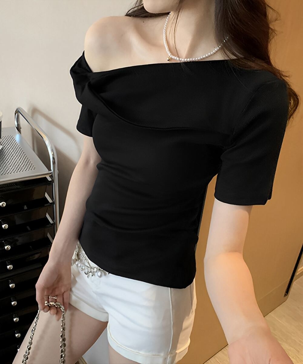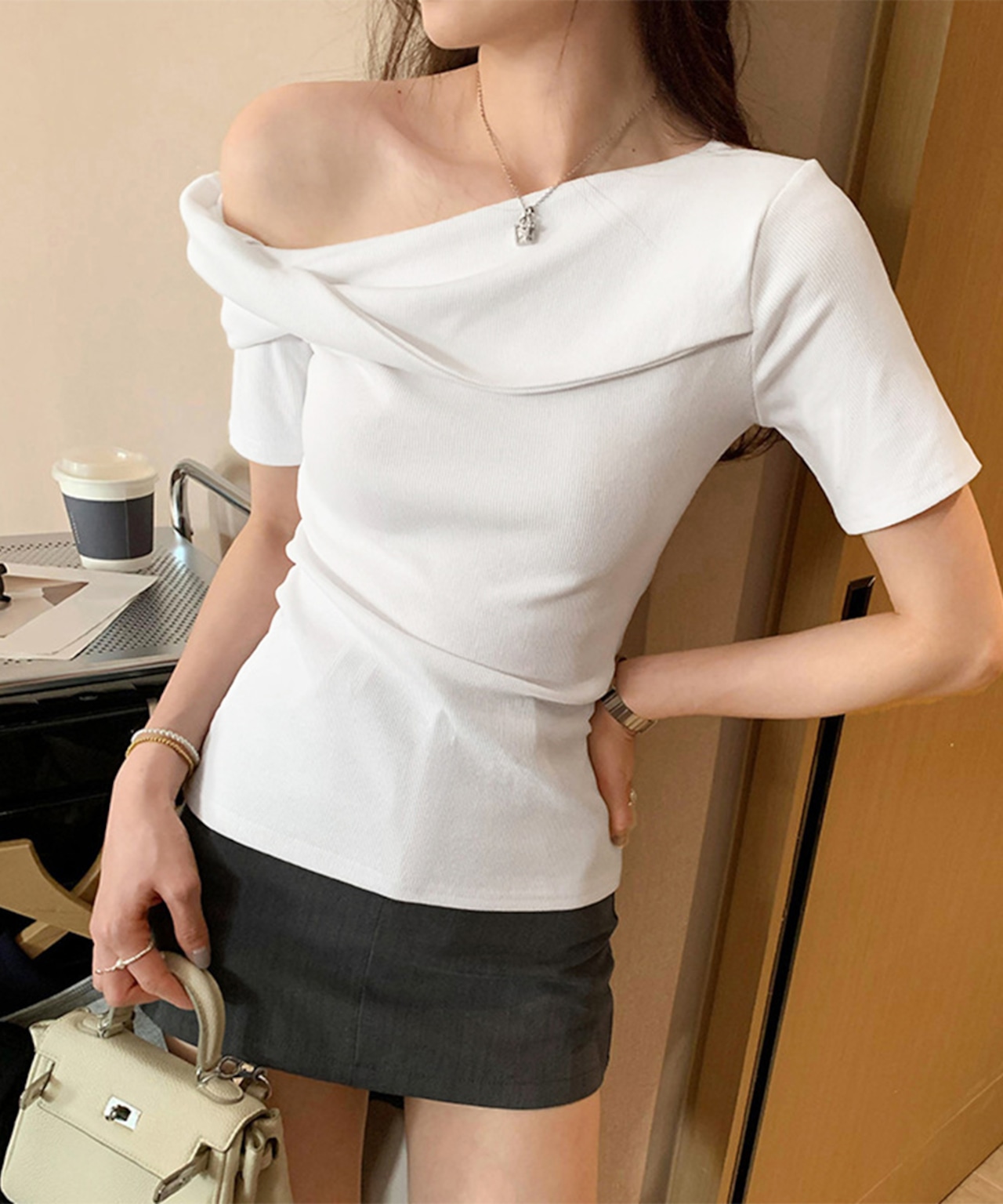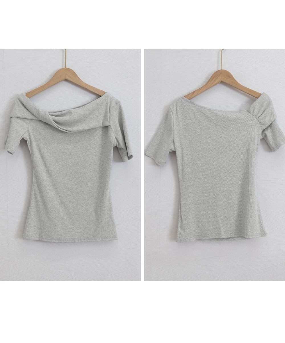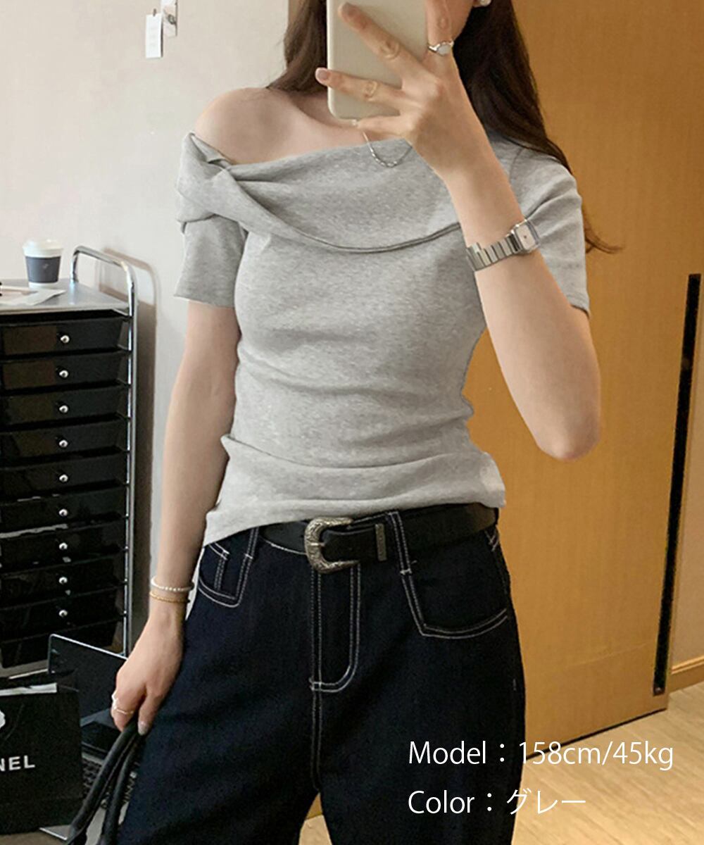 ツイストデザインが個性的で、肩元をさりげなく露出し、女性らしい抜け感を演出する半袖Tシャツ。
