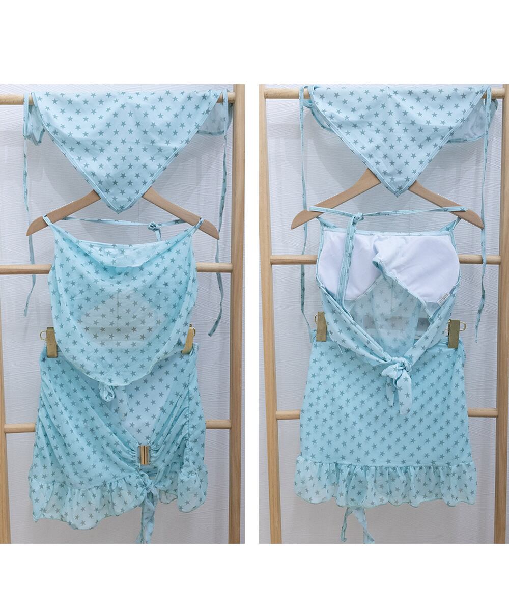 星柄プリントが印象的なトップス、スカート、三角巾の個性派3点セットで、これ1つで簡単におしゃれコーデが完成。