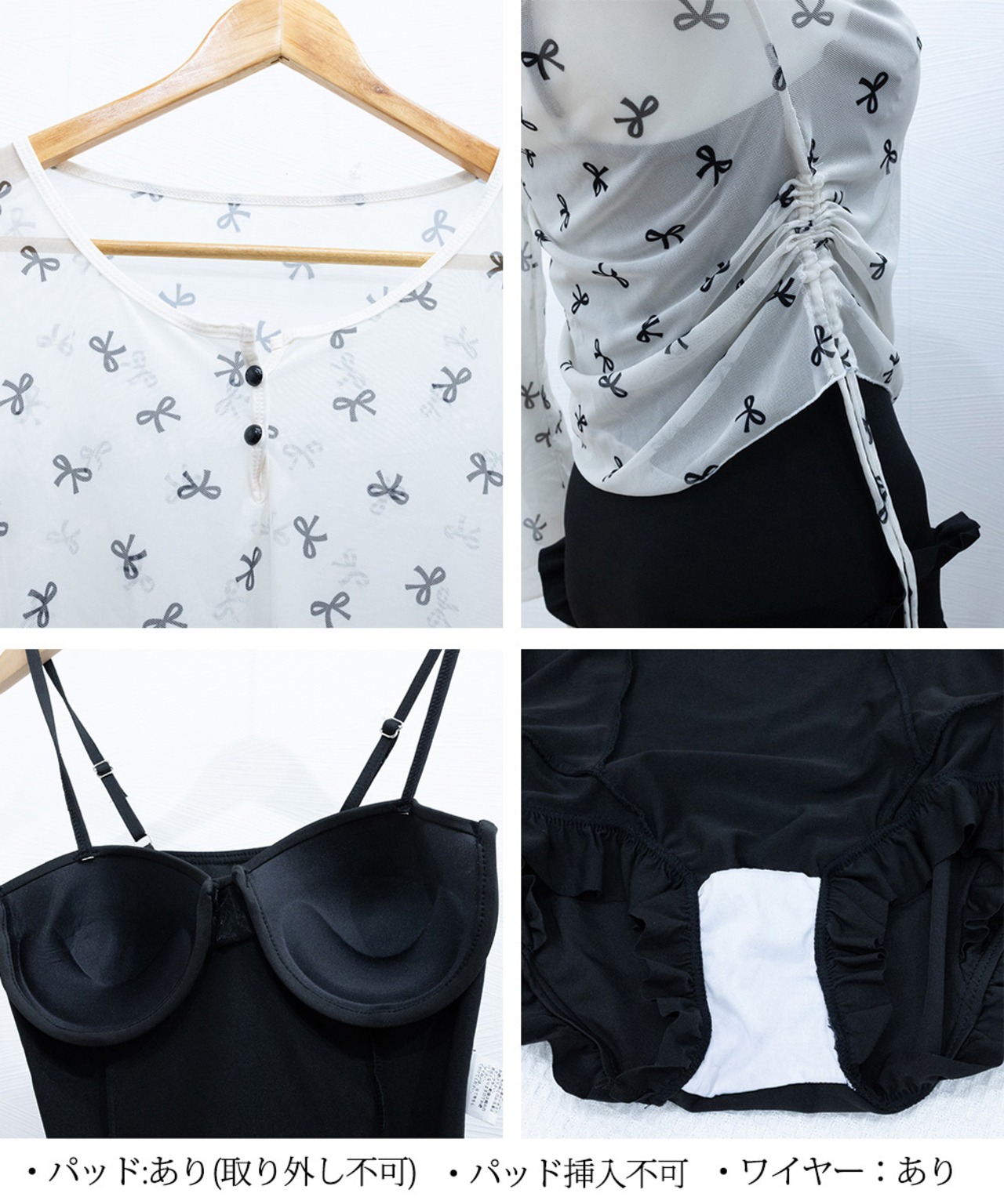 2点セット水着 体型カバー リボン柄 シースルー トップス 海 リゾート 水着 露出控えめ サイドドローストリング水着
