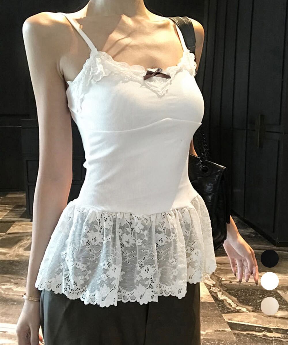 チビリボンと裾レースのディテールがガーリーな印象のパッド付きキャミソール。