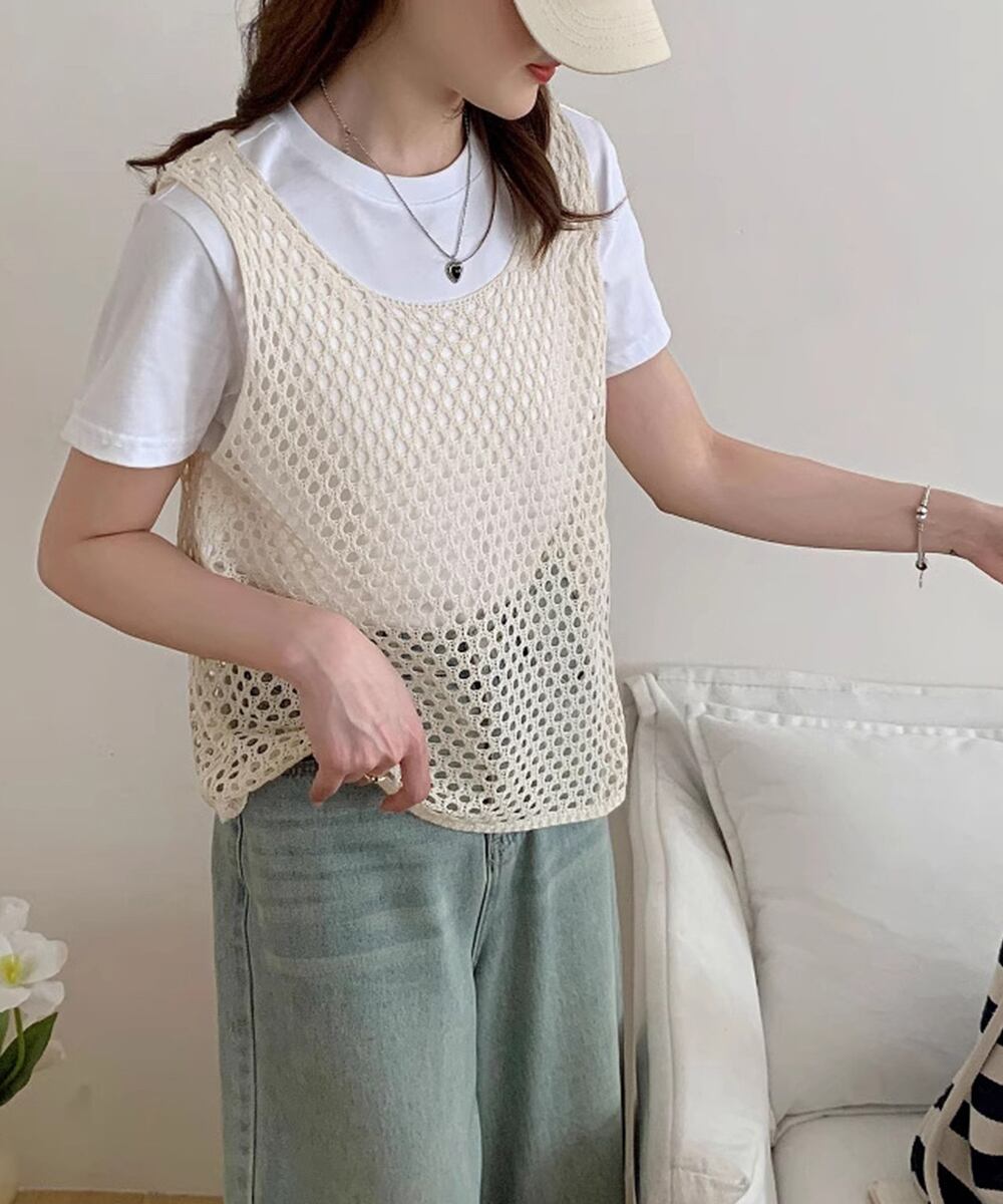 レディース メッシュ編み サマーニット ノースリーブ 薄手タンクニット 涼しげ レイヤードベスト カジュアル チョッキ春