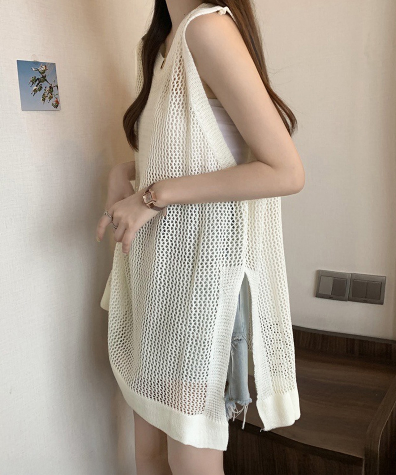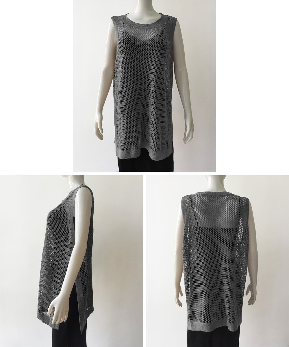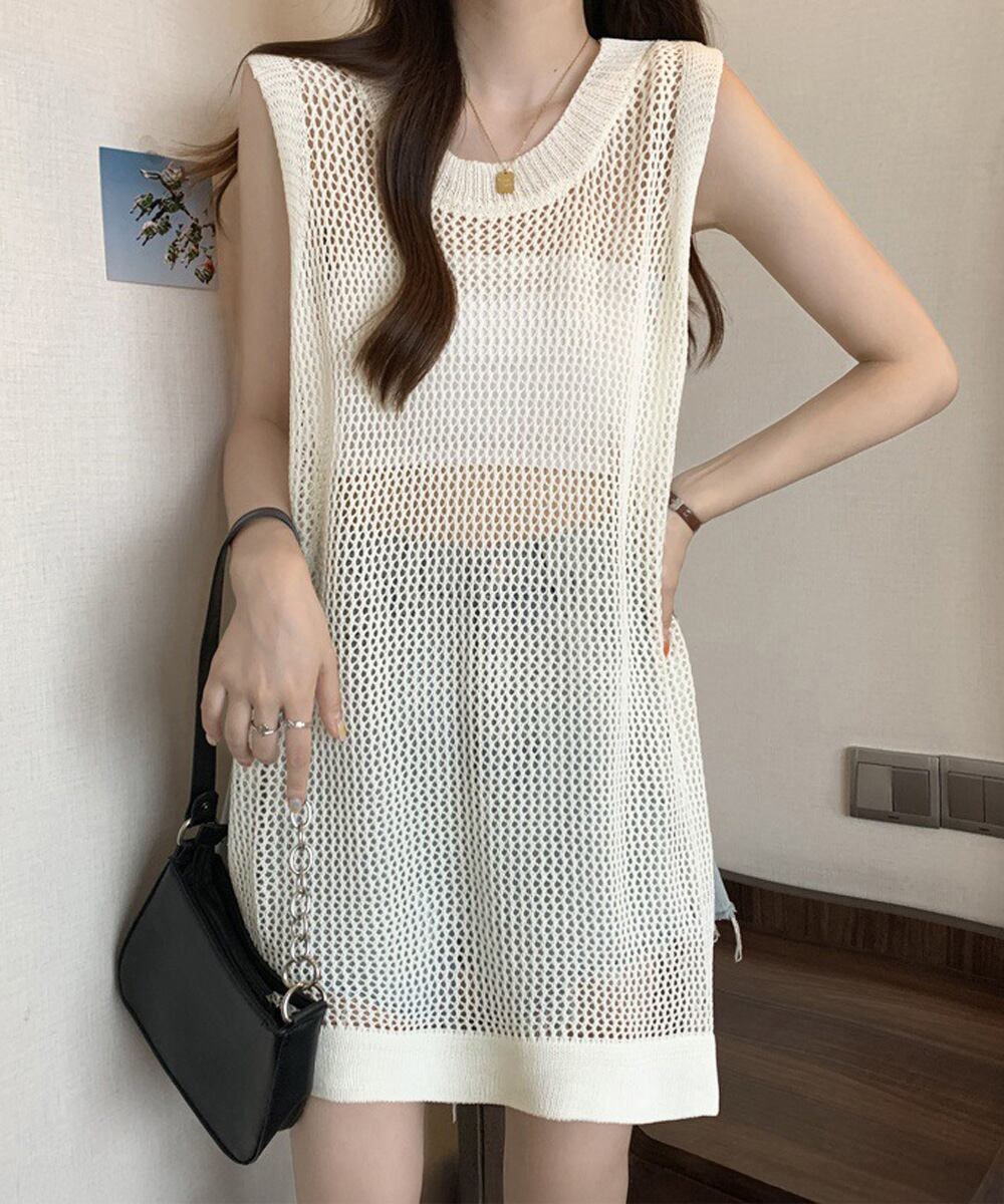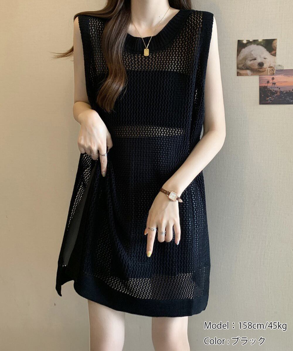 チュニックニットベスト レディース ノースリーブニットトップス ゆったり 無地レイヤードワンピース 透かし編みベスト夏服