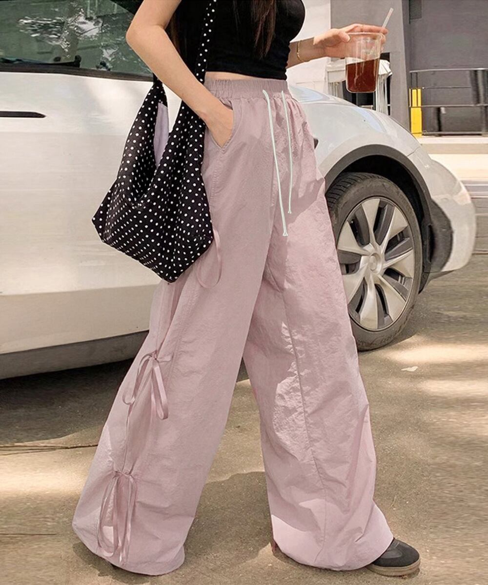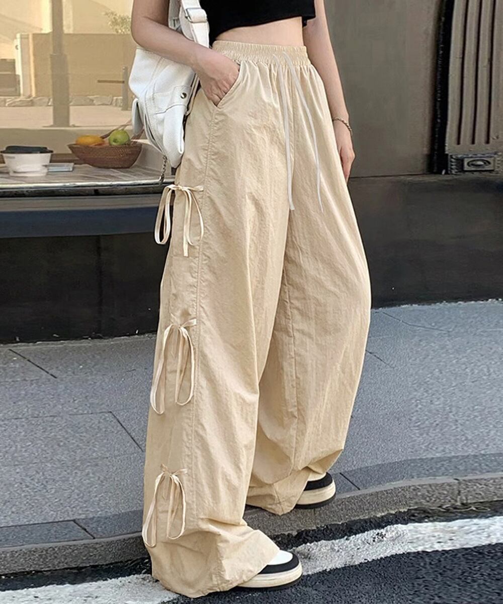 サイドリボンがアクセントになった、ラフなムード漂うカーゴ風ワイドパンツ。