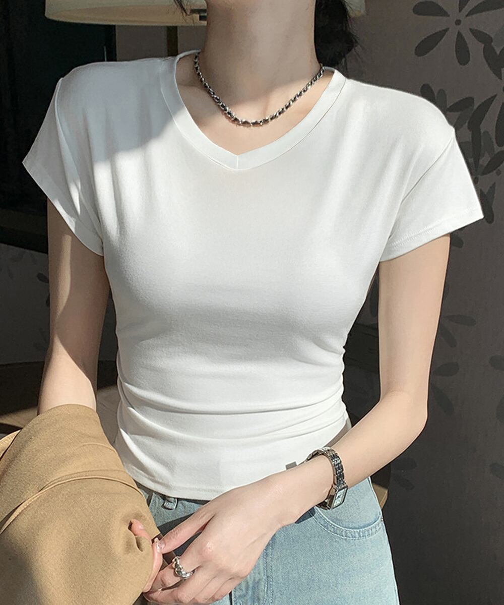 程よく開いたVネックがデコルテを美しく魅せる、心地よい綿混素材の無地半袖Tシャツ