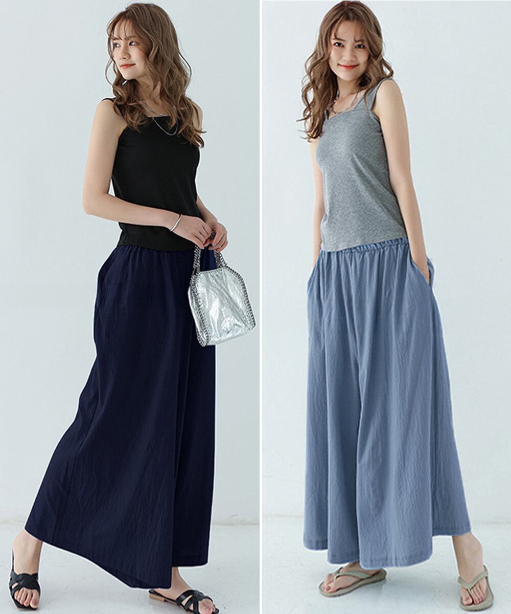 ウエストはゴム仕様、両サイドにポケット付きで、毎日にうれしい使い勝手の良さ