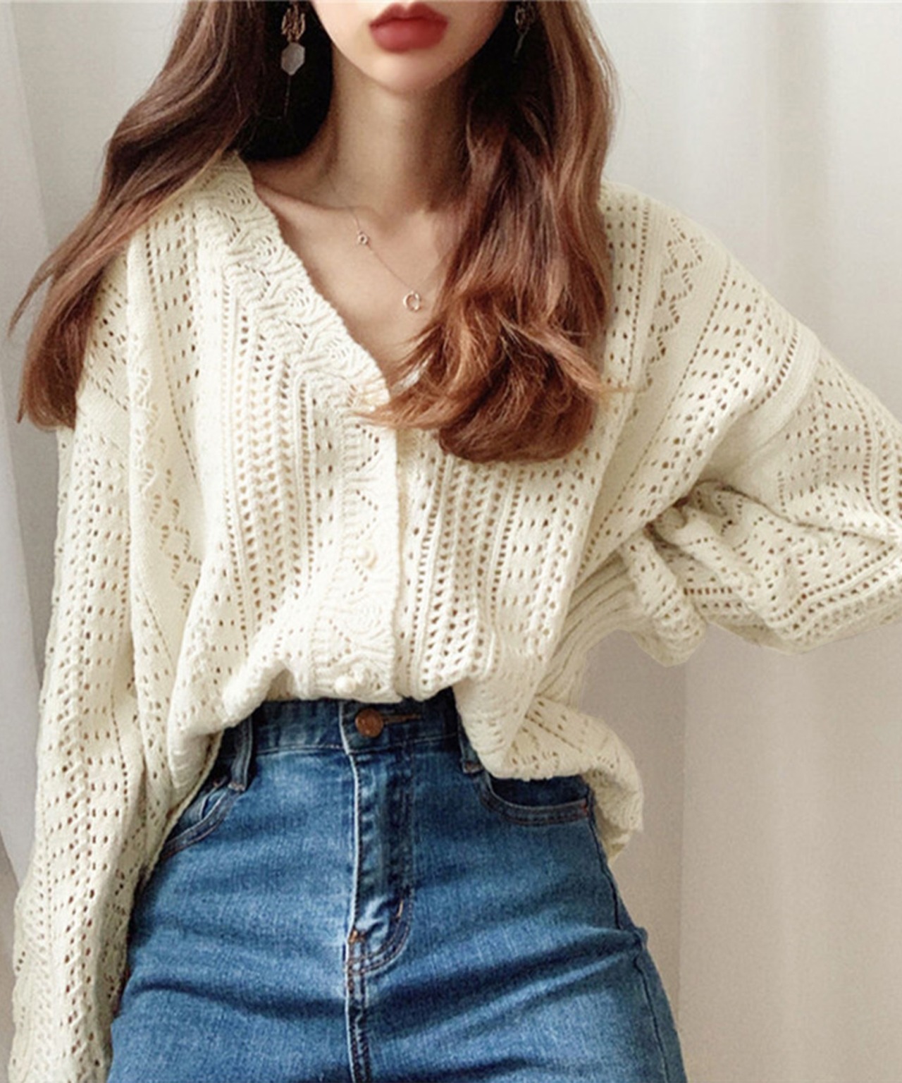 春夏はもちろん、秋にも活躍するゆったりシルエットの透かし編みニットカーディガン。