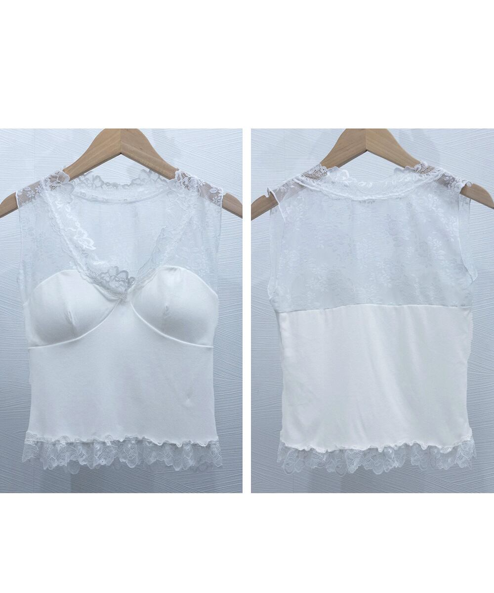 肩と胸元、そして裾周りに施されたレースデザインが、可愛らしさとセクシーさを兼ね備えたパッド付ブラトップ