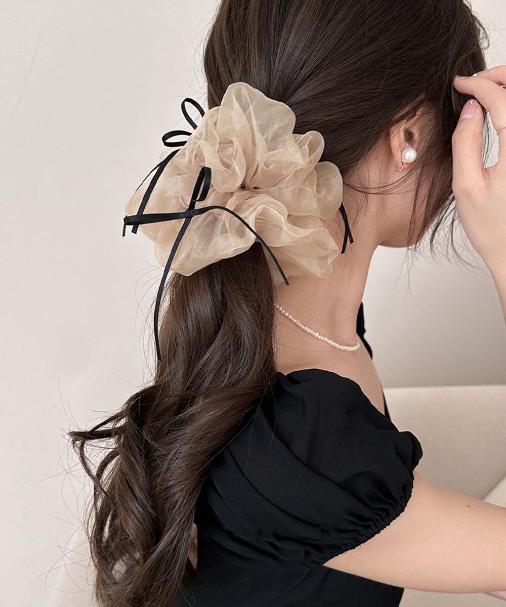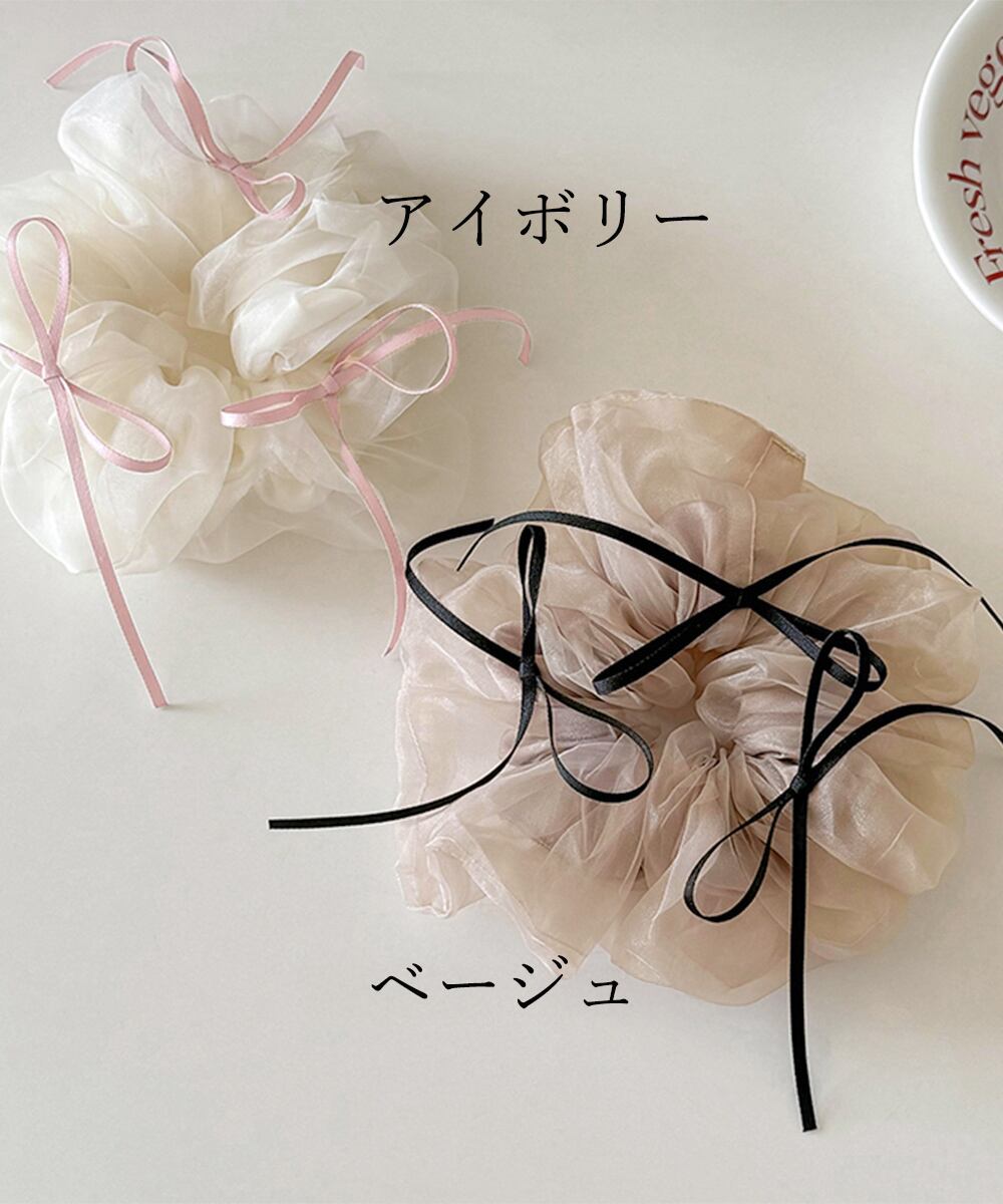 やわらかなシフォン素材に、細リボンのアクセントが可愛いボリュームシュシュ