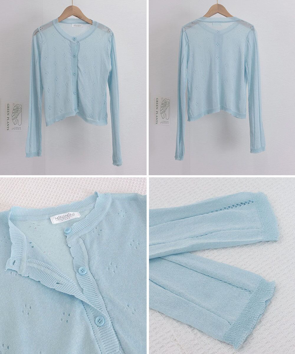 爽やかなカラーが魅力の透かし編みクロップド丈カーディガン。