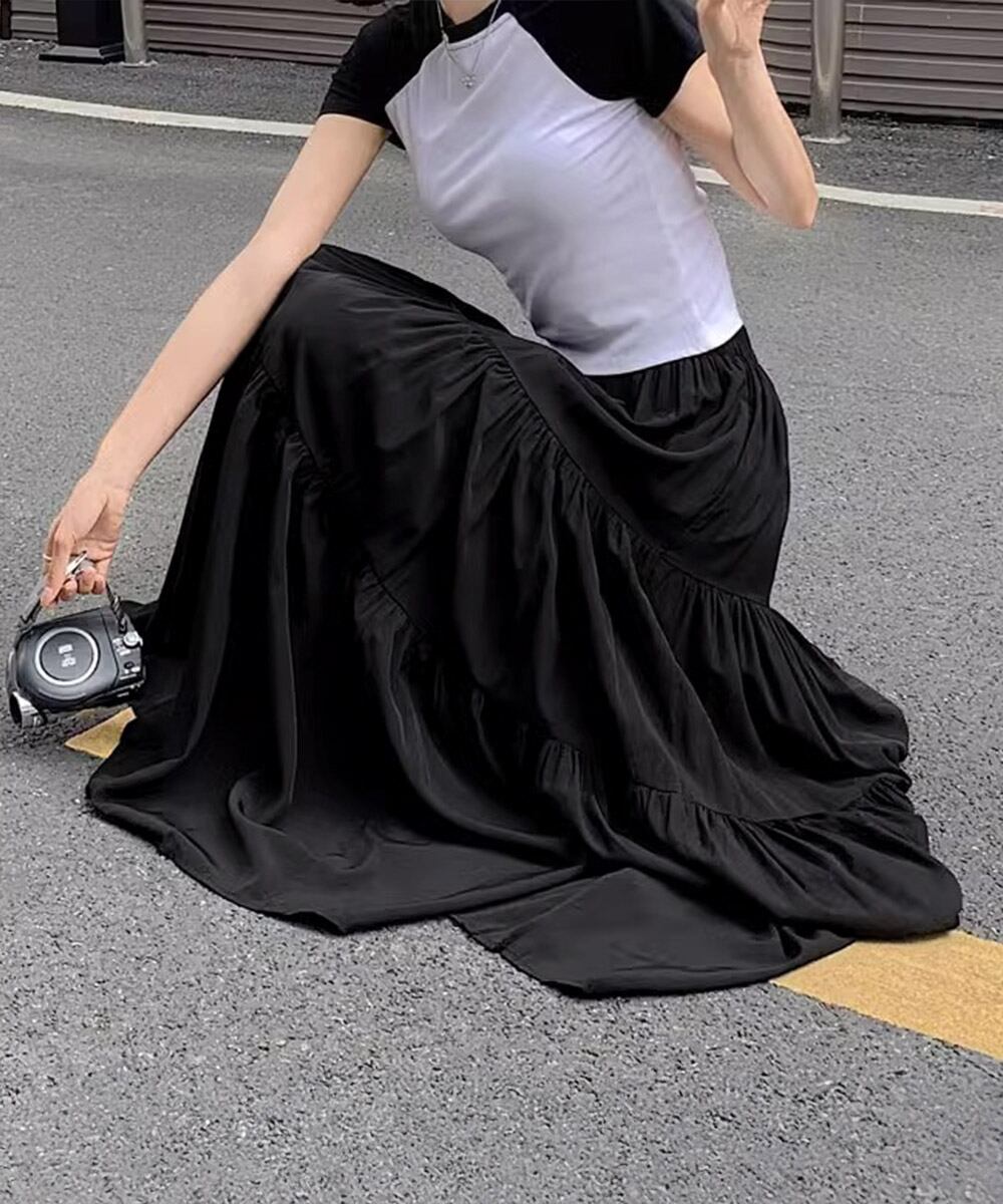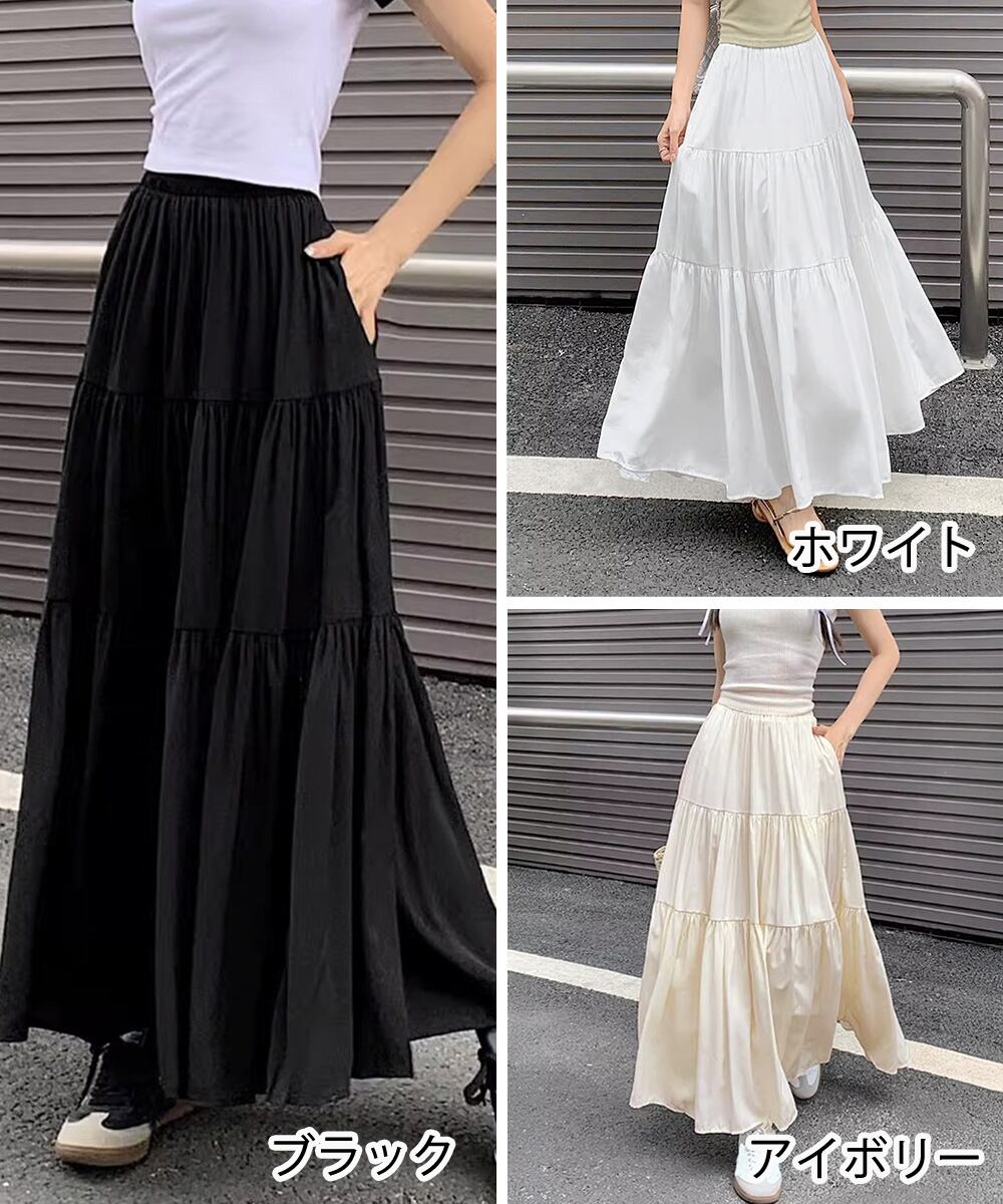 ハイウエストプリーツスカート 体型カバーボトムス ウエストゴム 切り替えフレアスカート きれいめ大人可愛いマキシスカート