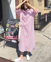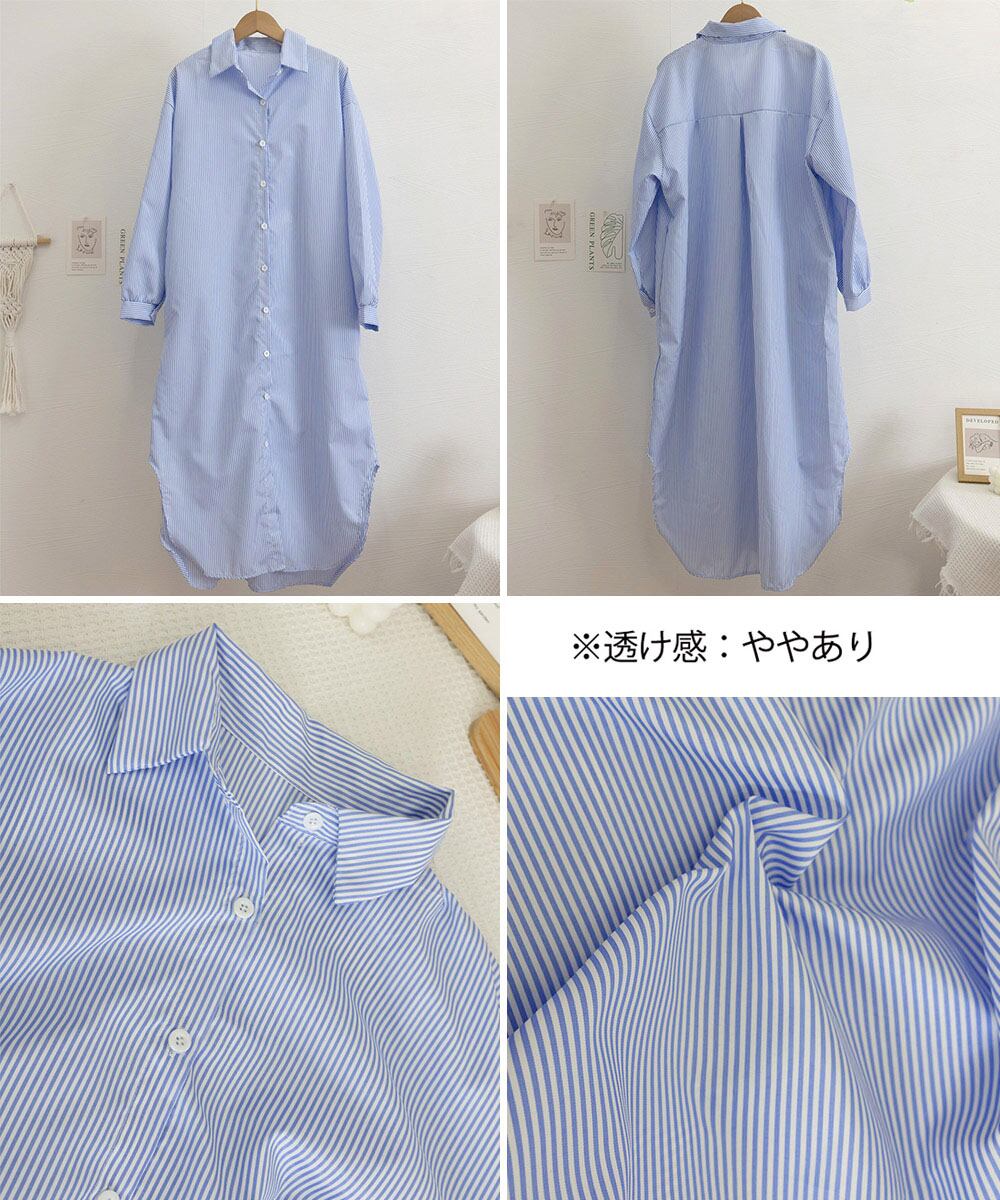 ストライプシャツワンピ ロングワンピースミモレ丈 カジュアル ボリュームスリーブシャツカーディガンサイドスリット 韓国風