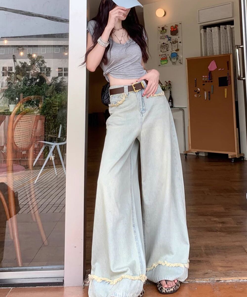 ハイウエスト デニムワイドパンツ 韓国風