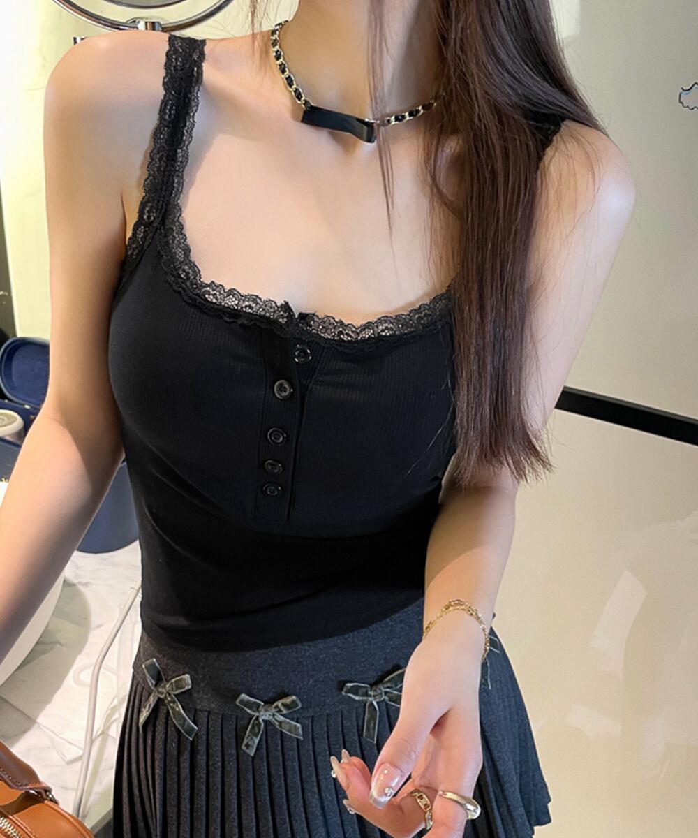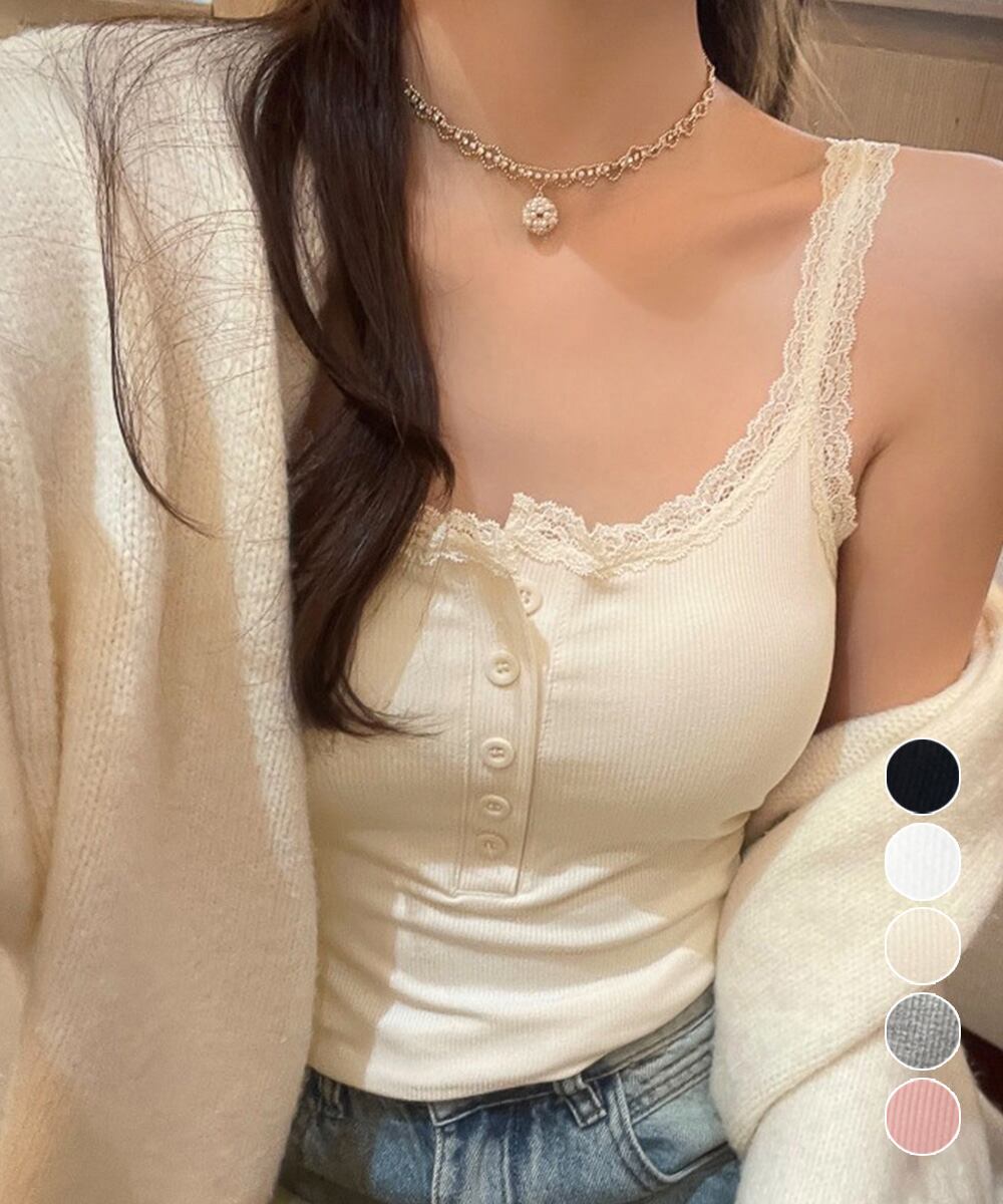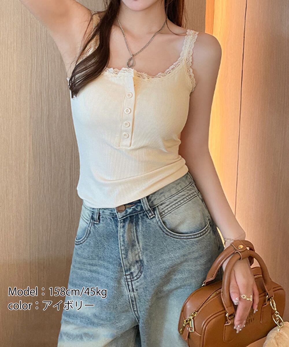 柔らかなリブ素材を使用したレース付きキャミソール。