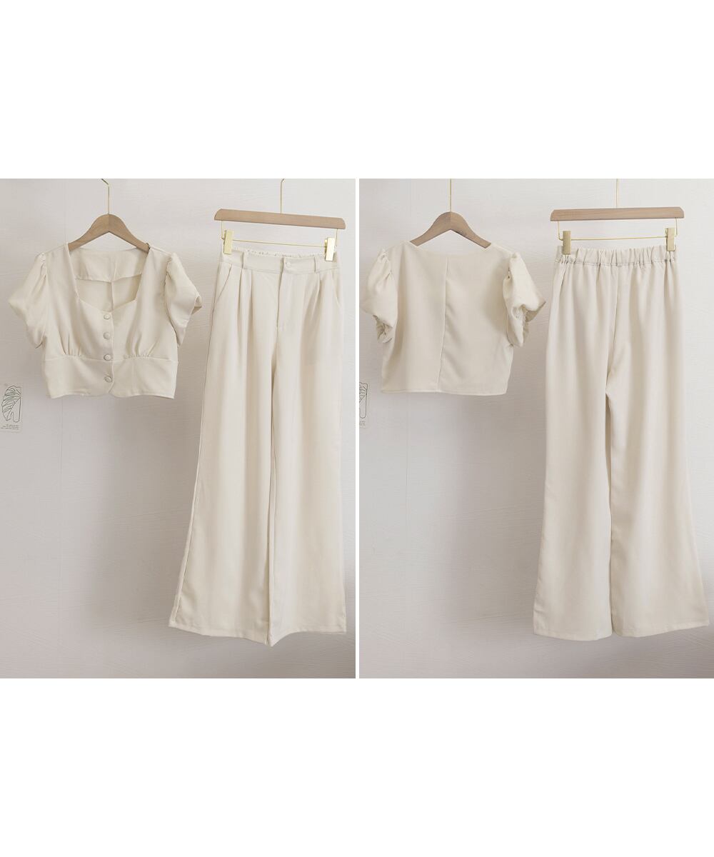 半袖のスクエアネックトップスとタック入りのロングパンツがセットになった、おしゃれな上下2点セットアップ