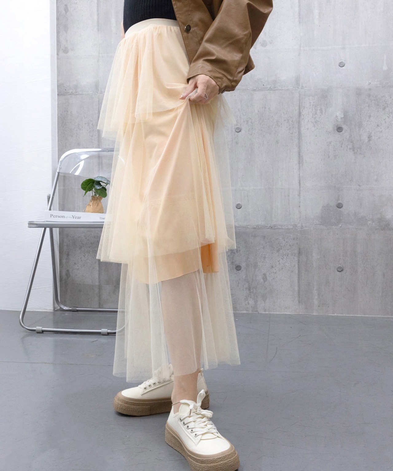 軽やかなチュール素材がエアリーなシルエットを演出するティアードスカート