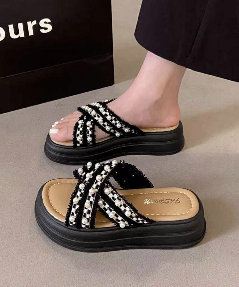レディース ツイードサマーサンダル 美脚 歩きやすいビーチサンダル 大人可愛い夏靴 履きやすい 真珠付きサンダルおしゃれ