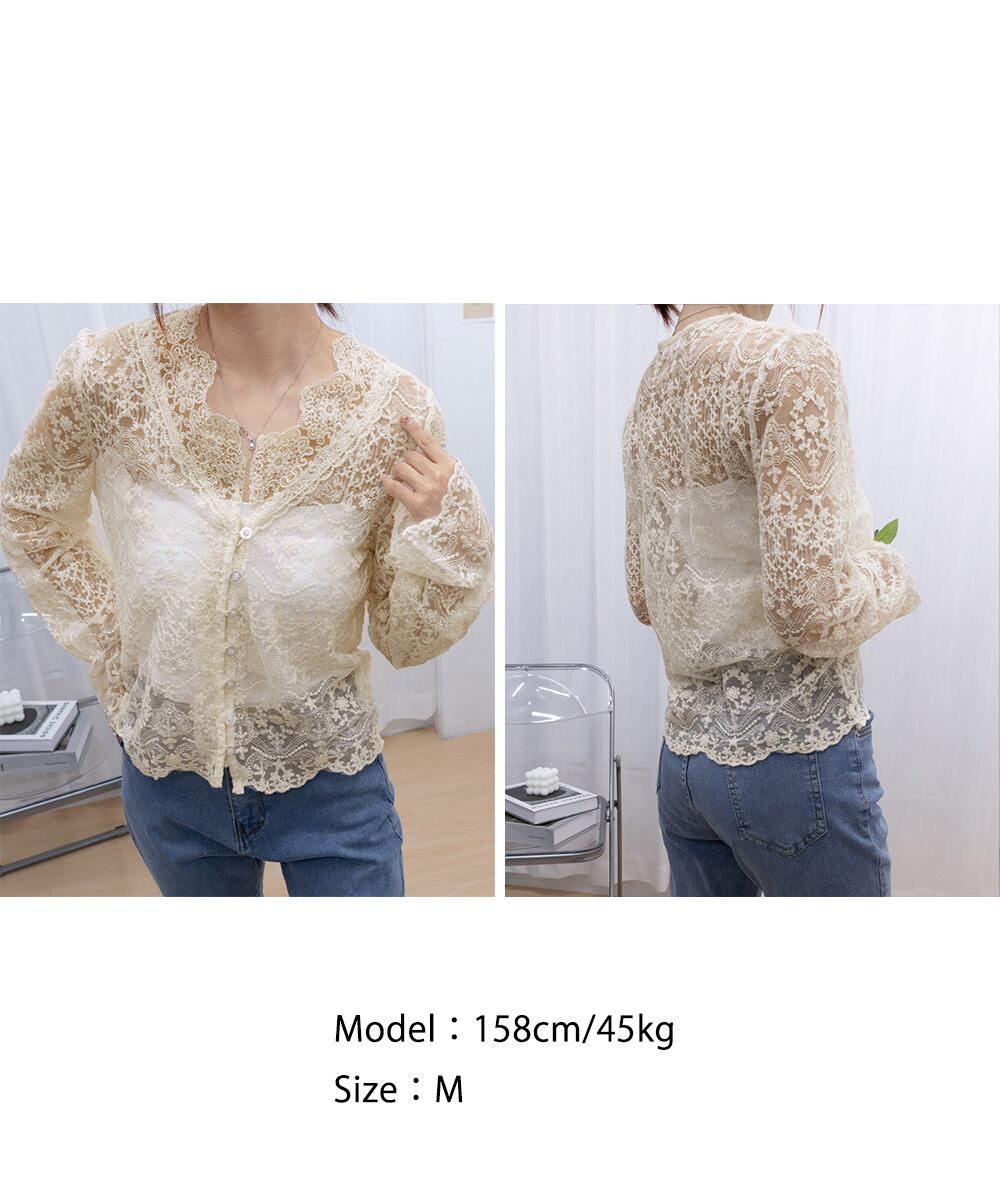 軽やかで繊細な花柄レース生地を使用したVネックのキャンディスリーブシアーブラウス