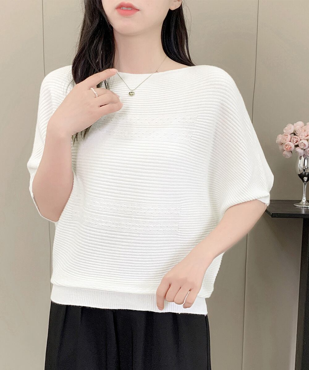 上品な編み目パターンが施された、柔らかな肌触りの半袖ニットトップス