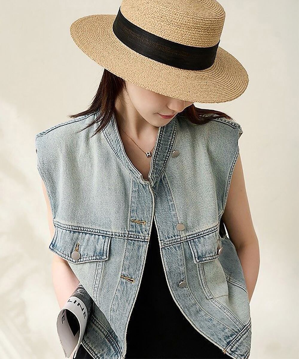 スタンドカラー デニムジャケットノースリーブ  体型カバー ゆったりデニムジレ 肩パッド入り レトロ韓国風カジュアルジレ